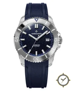 Eine Taucheruhr-Uhr mit einem markanten 44.5mm Auftritt am Handgelenk, gefertigt aus Edelstahl mit einem Zifferblatt in blau und einer besonderen "aventurine (sparkling/starfield)"-Oberfläche.
