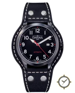 Eine Pilot-Uhr mit einem markanten 42mm Auftritt am Handgelenk, gefertigt aus Edelstahl mit einem Zifferblatt in schwarz und einer besonderen "matte"-Oberfläche.