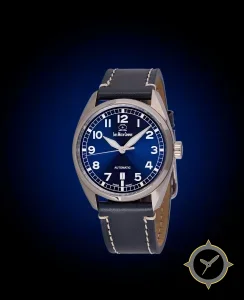 Eine Pilot-Uhr mit einem markanten 45mm Auftritt am Handgelenk, gefertigt aus Edelstahl mit einem Zifferblatt in blau und einer besonderen "sunburst"-Oberfläche.