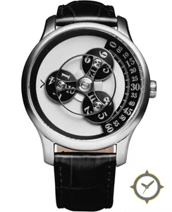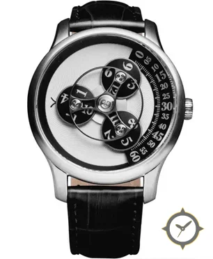 Eine Skelett-Uhr mit einem markanten 47.5mm Auftritt am Handgelenk, gefertigt aus Edelstahl mit einem Zifferblatt in weiß und einer besonderen "circular guilloché"-Oberfläche.