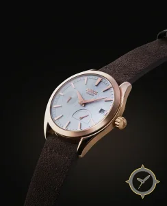 Eine Dress-Uhr mit einem 26mm Gehäuse im Vintage-Stil gefertigt aus Gold mit einem Zifferblatt in weiß und einer besonderen "subtle textured/map-like finish"-Oberfläche und einer praktischen Gangreserveanzeige.