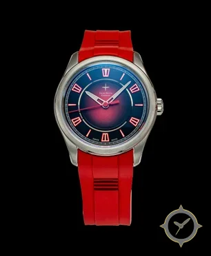 Eine Dress-Uhr mit einem vielseitigen 39.5mm Gehäuse, das an fast jedes Handgelenk passt, gefertigt aus Edelstahl mit einem Zifferblatt in rot und einer besonderen "fumé gradient (vignette, sunburst center to darker edge)"-Oberfläche.