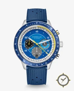 Eine Chronograph-Uhr mit einem markanten 46mm Auftritt am Handgelenk, gefertigt aus Edelstahl mit einem Zifferblatt in blau und einer besonderen "sunburst"-Oberfläche.