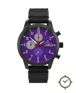 Eine Chronograph-Uhr mit einem vielseitigen 38.5mm Gehäuse, das an fast jedes Handgelenk passt, gefertigt aus Edelstahl mit einem Zifferblatt in lila und einer besonderen "matte"-Oberfläche.
