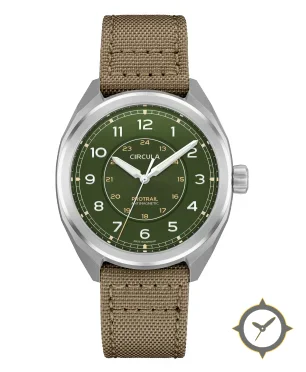 Eine Field-Uhr mit einem markanten 41.5mm Auftritt am Handgelenk, gefertigt aus Edelstahl mit einem Zifferblatt in grün und einer besonderen "matte with concentric circular guilloché in the center"-Oberfläche.
