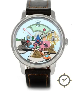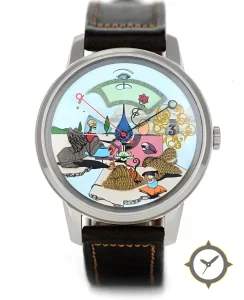 Eine Dress-Uhr mit einem 35mm Gehäuse im Vintage-Stil gefertigt aus Edelstahl mit einem Zifferblatt in blau und einer besonderen "hand-painted / enamel-style illustrated dial with glossy finish"-Oberfläche.