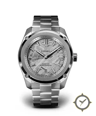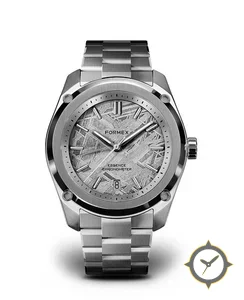 Eine Luxus-Uhr mit einem 33.5mm Gehäuse im Vintage-Stil gefertigt aus Edelstahl mit einem Zifferblatt in silber und einer besonderen "meteorite"-Oberfläche.