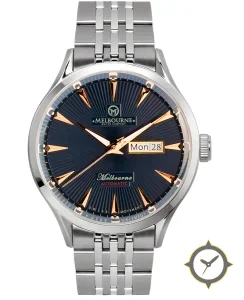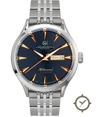 Eine Dress-Uhr mit einem 36.5mm Gehäuse im Vintage-Stil gefertigt aus Edelstahl mit einem Zifferblatt in marineblau und einer besonderen "sunburst"-Oberfläche.