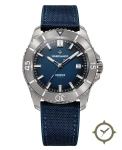 Eine Taucheruhr-Uhr mit einem markanten 41.5mm Auftritt am Handgelenk, gefertigt aus Titan mit einem Zifferblatt in blau und einer besonderen "sunburst"-Oberfläche.