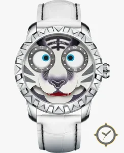 Eine Luxus-Uhr mit einem vielseitigen 39.5mm Gehäuse, das an fast jedes Handgelenk passt, gefertigt aus Edelstahl mit einem Zifferblatt in weiß und einer besonderen "printed/multi-layer applique"-Oberfläche.