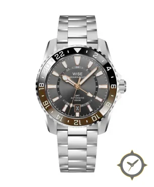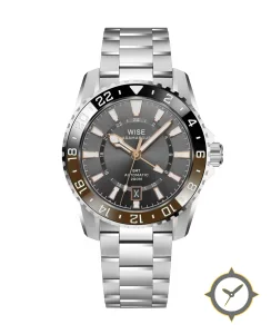 Eine GMT-Uhr mit einem markanten 44.5mm Auftritt am Handgelenk, gefertigt aus Edelstahl mit einem Zifferblatt in grau und einer besonderen "fumé / sunburst gradient"-Oberfläche und einer echten GMT-Funktion, mit der du eine zweite Zeitzone verfolgen kannst.