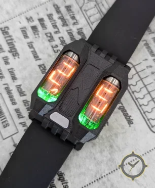 Eine Digital-Uhr mit einem markanten 65.5mm Auftritt am Handgelenk, gefertigt aus Harz mit einem Zifferblatt in schwarz und einer besonderen "glass tubes with illuminated filament-style LEDs"-Oberfläche.