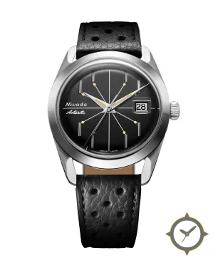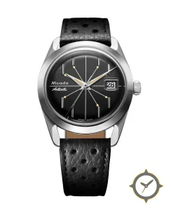 Eine Vintage-Uhr mit einem 36.5mm Gehäuse im Vintage-Stil gefertigt aus Edelstahl mit einem Zifferblatt in schwarz und einer besonderen "sunburst radial glossy finish"-Oberfläche.