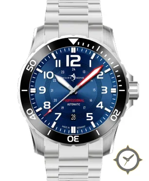 Eine Taucheruhr-Uhr mit einem markanten 44mm Auftritt am Handgelenk, gefertigt aus Edelstahl mit einem Zifferblatt in blau und einer besonderen "sunburst"-Oberfläche.