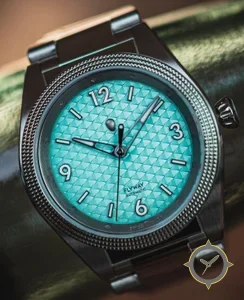 Eine Sport-Uhr mit einem 30mm Gehäuse im Vintage-Stil gefertigt aus Edelstahl mit einem Zifferblatt in türkis und einer besonderen "guilloché / embossed geometric texture"-Oberfläche.