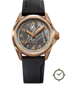 Eine Taucheruhr-Uhr mit einem 35mm Gehäuse im Vintage-Stil gefertigt aus Bronze mit einem Zifferblatt in grau und einer besonderen "meteorite (Widmanstätten) texture"-Oberfläche.