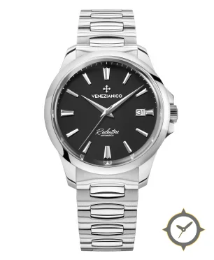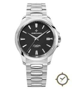 Eine Sport-Uhr mit einem markanten 45.5mm Auftritt am Handgelenk, gefertigt aus Edelstahl mit einem Zifferblatt in schwarz und einer besonderen "glossy lacquer"-Oberfläche.