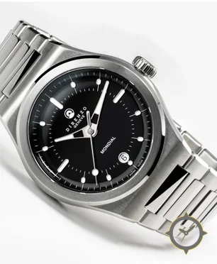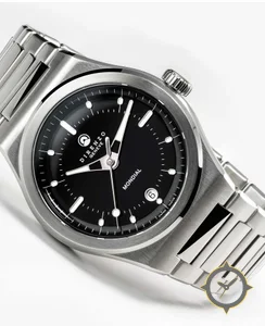 Eine Sport-Uhr mit einem 34.5mm Gehäuse im Vintage-Stil gefertigt aus Edelstahl mit einem Zifferblatt in schwarz und einer besonderen "glossy lacquer"-Oberfläche.