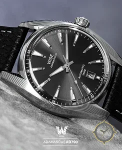 Eine Dress-Uhr mit einem 31.5mm Gehäuse im Vintage-Stil gefertigt aus Edelstahl mit einem Zifferblatt in schwarz und einer besonderen "sunburst"-Oberfläche.