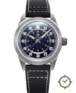 Eine Pilot-Uhr mit einem 36.5mm Gehäuse im Vintage-Stil gefertigt aus Titan mit einem Zifferblatt in marineblau und einer besonderen "aventurine (sparkling)"-Oberfläche.