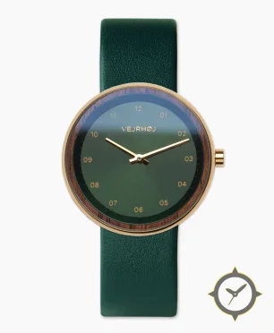 Eine Minimalistisch-Uhr mit einem vielseitigen 40.5mm Gehäuse, das an fast jedes Handgelenk passt, gefertigt aus Gold mit einem Zifferblatt in grün und einer besonderen "sunburst"-Oberfläche.
