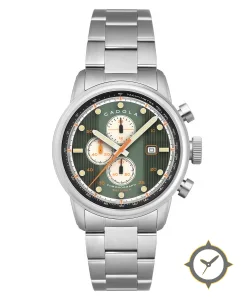 Eine Chronograph-Uhr mit einem markanten 49.5mm Auftritt am Handgelenk, gefertigt aus Edelstahl mit einem Zifferblatt in grün und einer besonderen "vertical-striped"-Oberfläche.