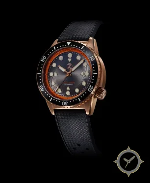 Eine Taucheruhr-Uhr mit einem 36mm Gehäuse im Vintage-Stil gefertigt aus Bronze mit einem Zifferblatt in blau und einer besonderen "wavy sunburst / textured guilloché"-Oberfläche.