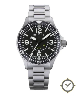 Eine GMT-Uhr mit einem 32mm Gehäuse im Vintage-Stil gefertigt aus Edelstahl mit einem Zifferblatt in schwarz und einer besonderen "matte"-Oberfläche und einer echten GMT-Funktion, mit der du eine zweite Zeitzone verfolgen kannst.