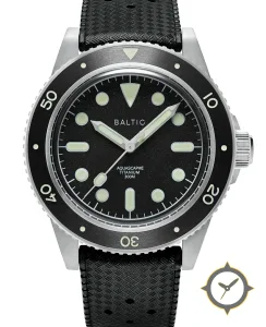 Eine Taucheruhr-Uhr mit einem 34.5mm Gehäuse im Vintage-Stil gefertigt aus Titan mit einem Zifferblatt in schwarz und einer besonderen "matte grained / sandblasted"-Oberfläche.