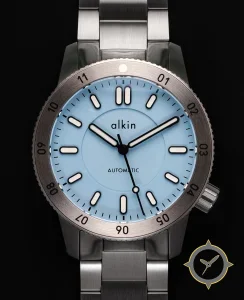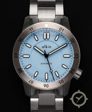 Eine Taucheruhr-Uhr mit einem 33.5mm Gehäuse im Vintage-Stil gefertigt aus Edelstahl mit einem Zifferblatt in blau und einer besonderen "matte"-Oberfläche.