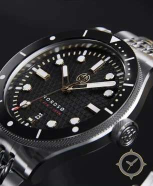 Eine Taucheruhr-Uhr mit einem 37.5mm Gehäuse im Vintage-Stil gefertigt aus Edelstahl mit einem Zifferblatt in schwarz und einer besonderen "geometric diamond/waffle texture"-Oberfläche.