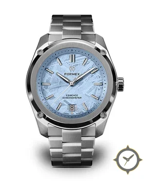 Eine Luxus-Uhr mit einem 35mm Gehäuse im Vintage-Stil gefertigt aus Edelstahl mit einem Zifferblatt in blau und einer besonderen "meteorite"-Oberfläche.
