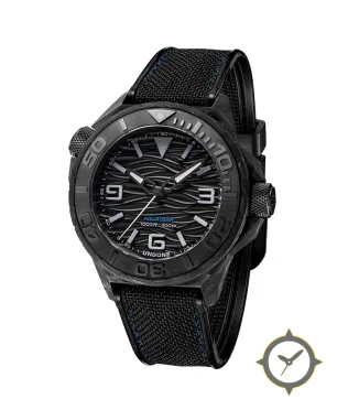 Eine Taucheruhr-Uhr mit einem vielseitigen 41mm Gehäuse, das an fast jedes Handgelenk passt, gefertigt aus Carbon mit einem Zifferblatt in schwarz und einer besonderen "textured wave (three-dimensional undulating pattern)"-Oberfläche.