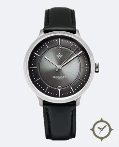 Eine Dress-Uhr mit einem markanten 43mm Auftritt am Handgelenk, gefertigt aus Edelstahl mit einem Zifferblatt in grau und einer besonderen "sunburst"-Oberfläche.