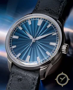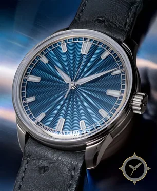 Eine Dress-Uhr mit einem markanten 42mm Auftritt am Handgelenk, gefertigt aus Edelstahl mit einem Zifferblatt in blau und einer besonderen "radial guilloché (engine-turned) with sunburst wave effect"-Oberfläche.