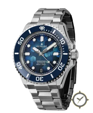 Eine Taucheruhr-Uhr mit einem 36mm Gehäuse im Vintage-Stil gefertigt aus Edelstahl mit einem Zifferblatt in blau und einer besonderen "iridescent / mother-of-pearl-like finish with depth"-Oberfläche.