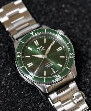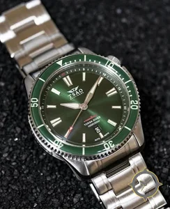 Eine Taucheruhr-Uhr mit einem vielseitigen 38.5mm Gehäuse, das an fast jedes Handgelenk passt, gefertigt aus Edelstahl mit einem Zifferblatt in grün und einer besonderen "sunburst"-Oberfläche.
