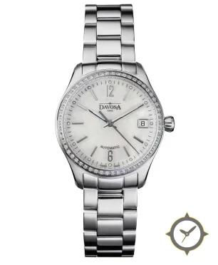 Eine Dress-Uhr mit einem 29.5mm Gehäuse im Vintage-Stil gefertigt aus Edelstahl mit einem Zifferblatt in weiß und einer besonderen "mother-of-pearl with concentric guilloché center"-Oberfläche.