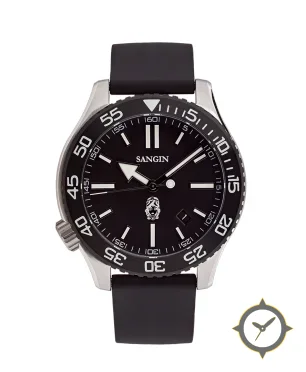 Eine Taucheruhr-Uhr mit einem markanten 45.5mm Auftritt am Handgelenk, gefertigt aus Edelstahl mit einem Zifferblatt in schwarz und einer besonderen "matte"-Oberfläche.