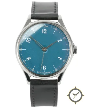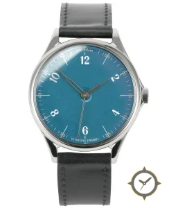 Eine Dress-Uhr mit einem 33mm Gehäuse im Vintage-Stil gefertigt aus Edelstahl mit einem Zifferblatt in türkis und einer besonderen "vitreous enamel (smooth enamel finish)"-Oberfläche.