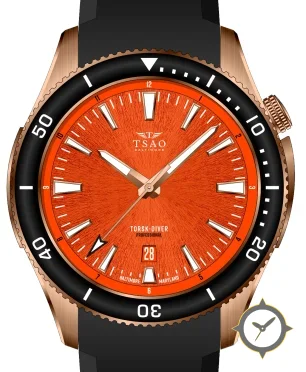 Eine Taucheruhr-Uhr mit einem markanten 46.5mm Auftritt am Handgelenk, gefertigt aus Bronze mit einem Zifferblatt in orange und einer besonderen "sunburst"-Oberfläche.