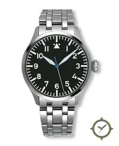 Eine Pilot-Uhr mit einem vielseitigen 38.5mm Gehäuse, das an fast jedes Handgelenk passt, gefertigt aus Edelstahl mit einem Zifferblatt in schwarz und einer besonderen "matte"-Oberfläche.