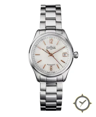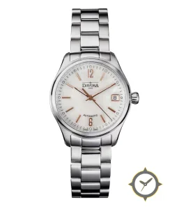 Eine Dress-Uhr mit einem 32mm Gehäuse im Vintage-Stil gefertigt aus Edelstahl mit einem Zifferblatt in weiß und einer besonderen "mother-of-pearl"-Oberfläche.