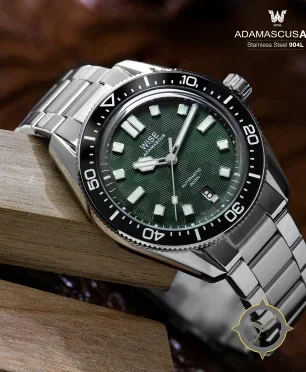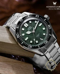 Eine Taucheruhr-Uhr mit einem vielseitigen 40mm Gehäuse, das an fast jedes Handgelenk passt, gefertigt aus Edelstahl mit einem Zifferblatt in grün und einer besonderen "textured chevron / wave guilloché"-Oberfläche.