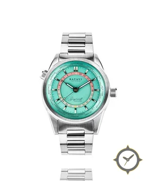 Eine GMT-Uhr mit einem vielseitigen 39.5mm Gehäuse, das an fast jedes Handgelenk passt, gefertigt aus Edelstahl mit einem Zifferblatt in türkis und einer besonderen "lacquered, slight sunburst with concentric rings"-Oberfläche und einer echten GMT-Funktion, mit der du eine zweite Zeitzone verfolgen kannst.