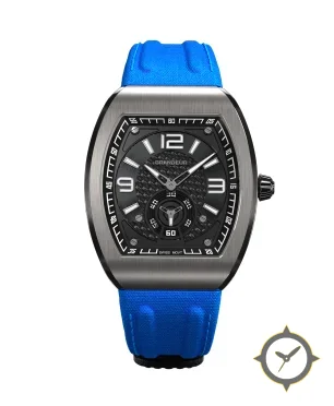 Eine Sport-Uhr gefertigt aus Edelstahl mit einem Zifferblatt in schwarz und einer besonderen "carbon-fiber weave"-Oberfläche.