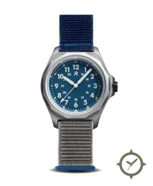 Eine Field-Uhr mit einem 35.5mm Gehäuse im Vintage-Stil gefertigt aus Edelstahl mit einem Zifferblatt in blau und einer besonderen "matte"-Oberfläche.