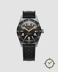 Eine Taucheruhr-Uhr mit einem 34mm Gehäuse im Vintage-Stil gefertigt aus Edelstahl mit einem Zifferblatt in schwarz und einer besonderen "matte"-Oberfläche.