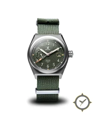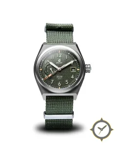 Eine Field-Uhr mit einem markanten 43mm Auftritt am Handgelenk, gefertigt aus Edelstahl mit einem Zifferblatt in grün und einer besonderen "textured/grain finish"-Oberfläche.