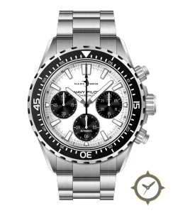 Eine Chronograph-Uhr mit einem markanten 43mm Auftritt am Handgelenk, gefertigt aus Edelstahl mit einem Zifferblatt in weiß und einer besonderen "matte lacquer finish"-Oberfläche.